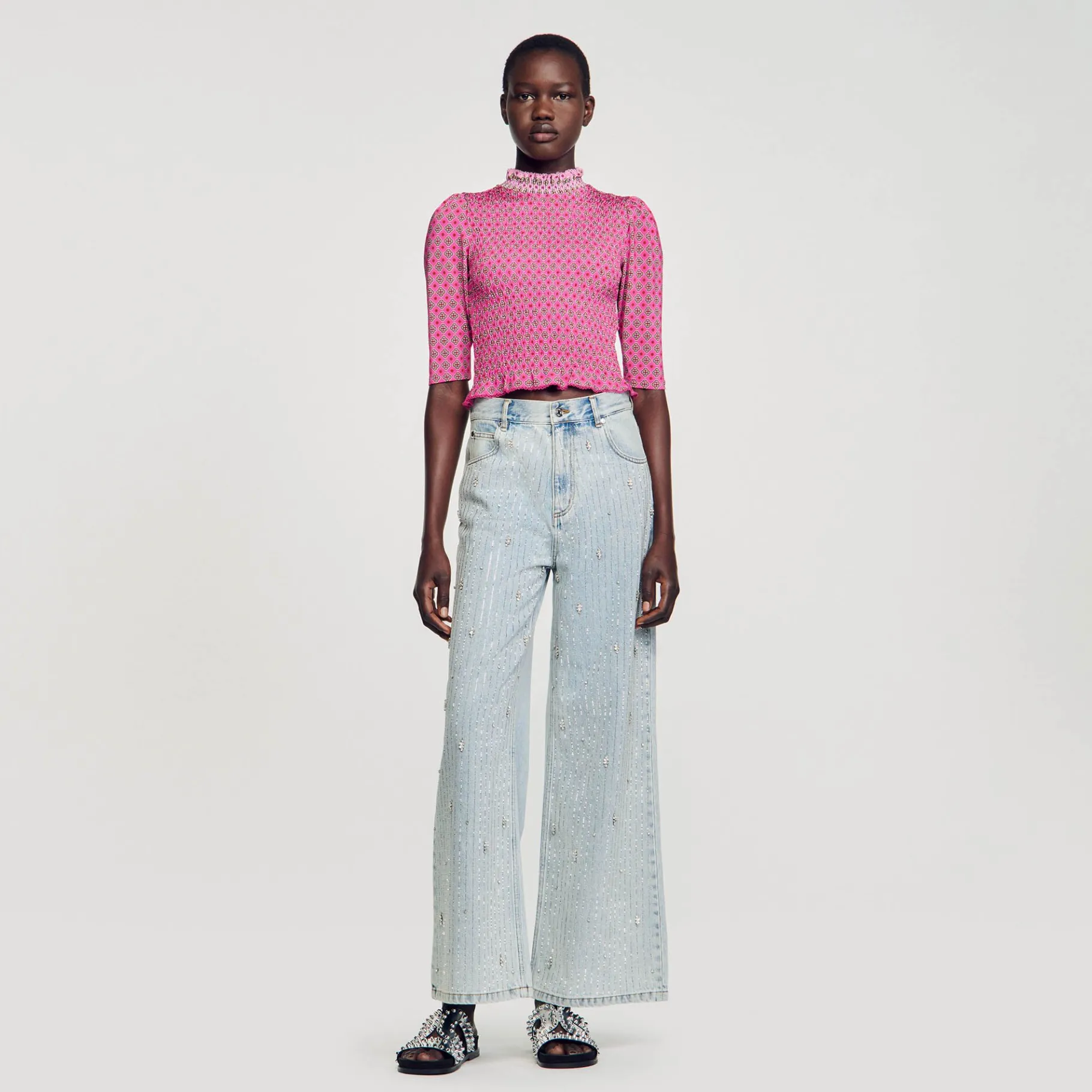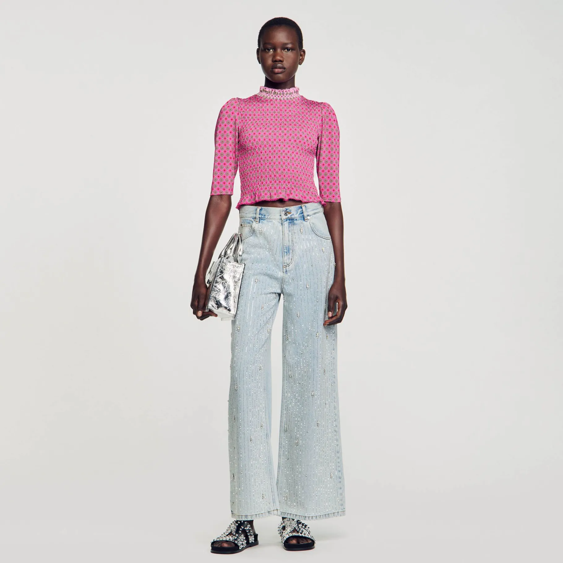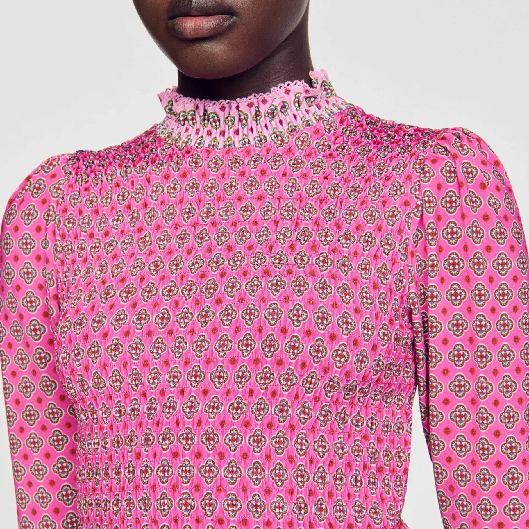 Camiseta Fruncida Con Cuello Redondo Subido, Manga Tres Cuartos Y Estampados En Contraste. Camiseta Fruncida Sandro Muje…