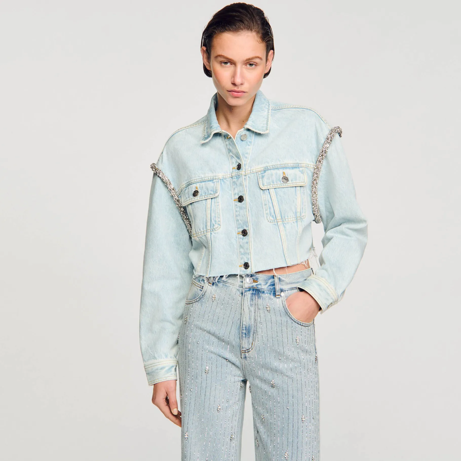 Cazadora Vaquera Corta Descolorida Con Manga Larga Con Puño Abotonado, Cierre De Botones, Cuello Con Solapa, Bolsillos Con Solapa, Decorada Con Brillantes En Las Sisas Y Bordes Sin Rematar En El Bajo.