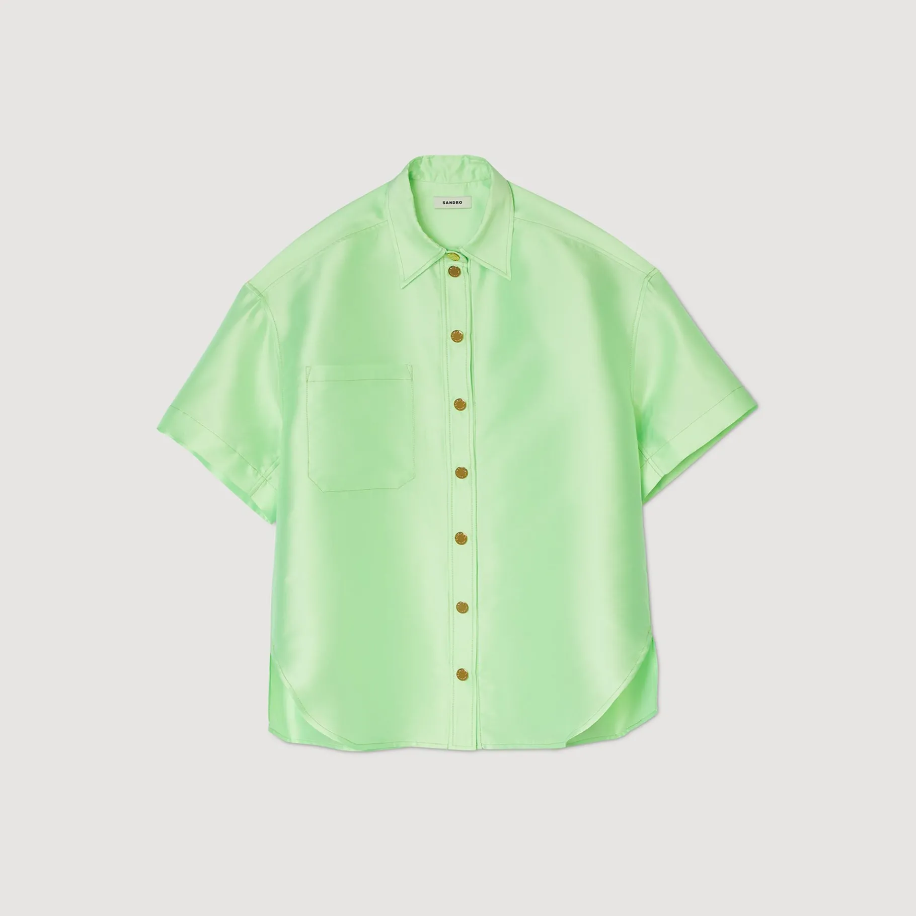 Camisa Oversize De Manga Corta Y Ancha De Satén, Con Un Bolsillo De Parche En El Pecho Y Tapeta De Botones Automáticos.