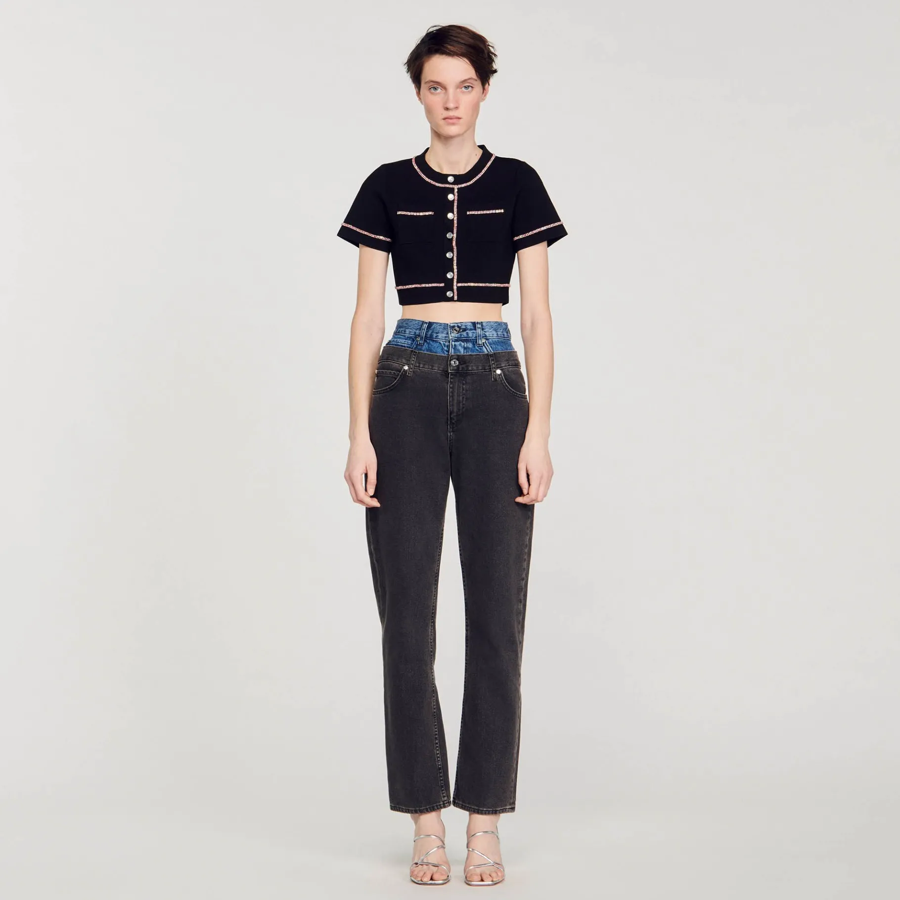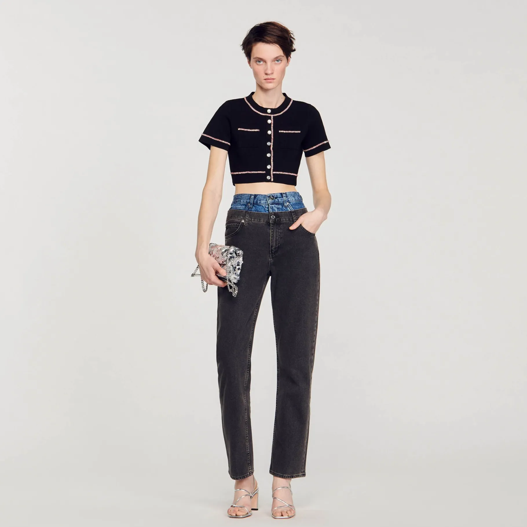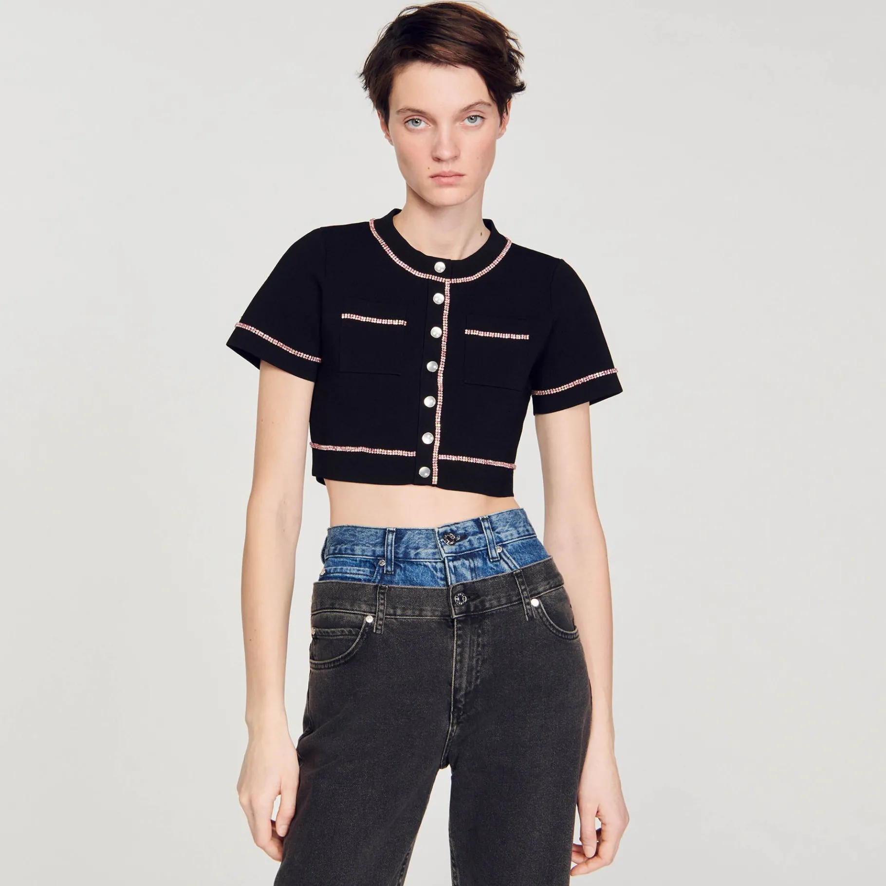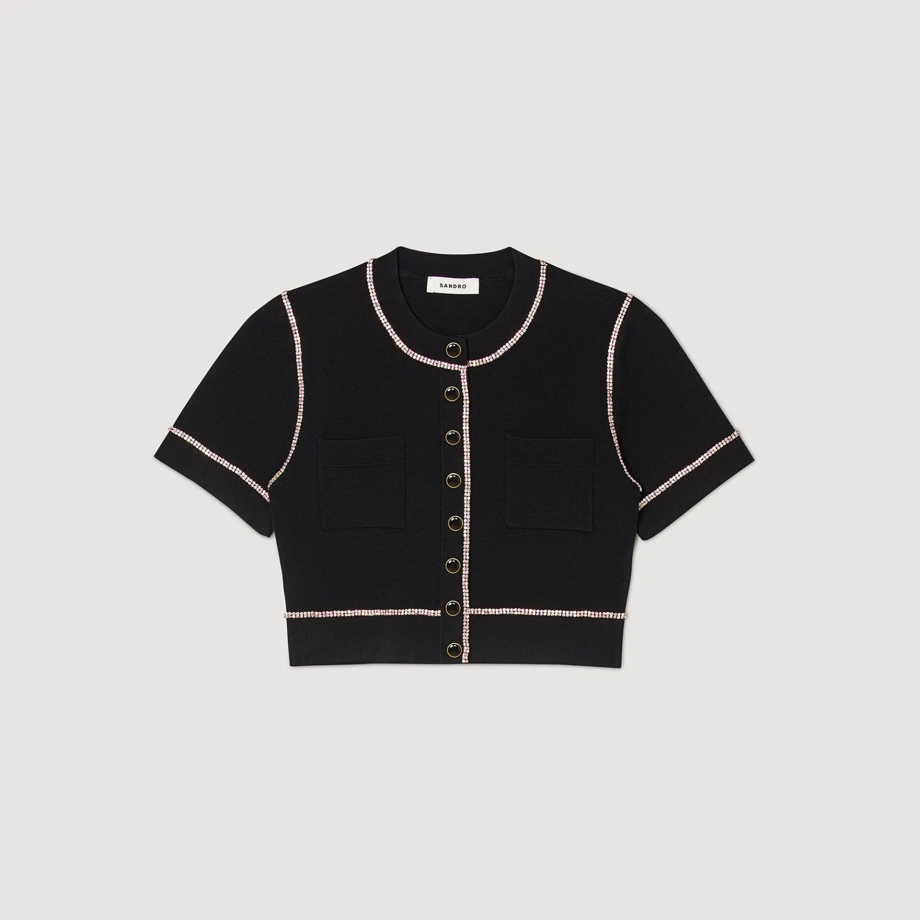 Cárdigan Corto Con Cuello Redondo Y Manga Corta Con Estrás Multicolor Y Con Bolsillos Tipo Parche En El Pecho.