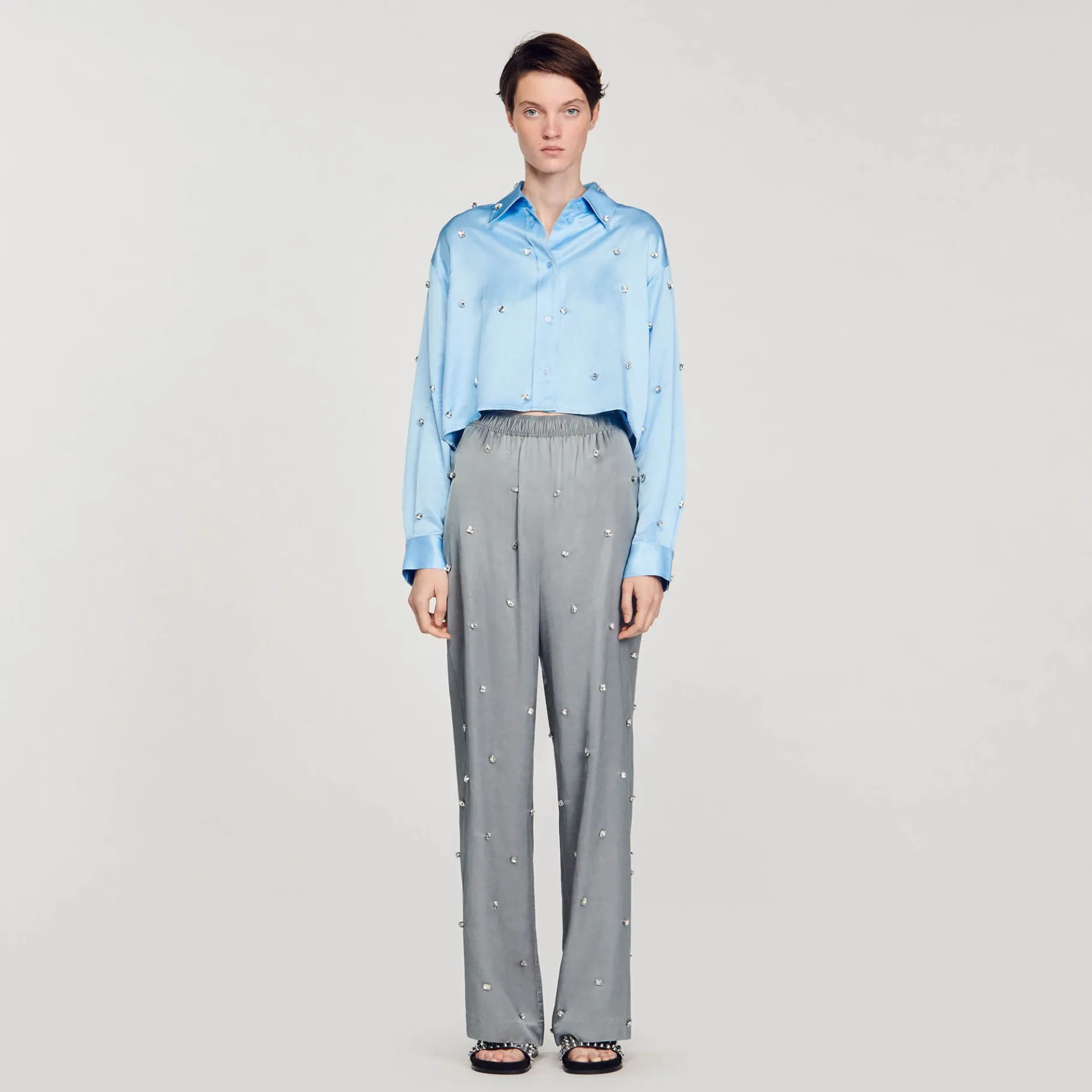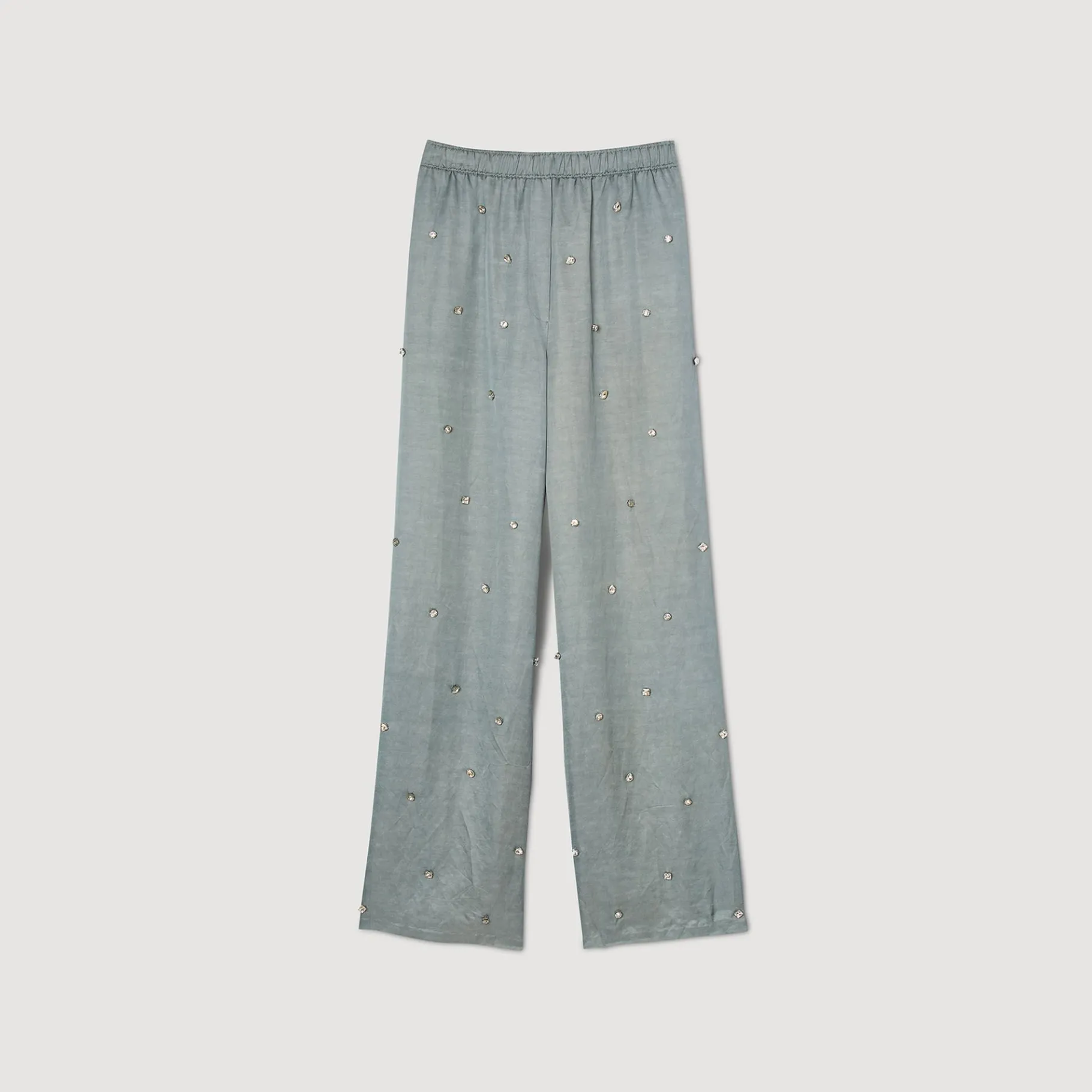 Pantalón Ancho, Fluido Y Satinado Con Cintura Elástica Y Detalle De Bordados De Strass.