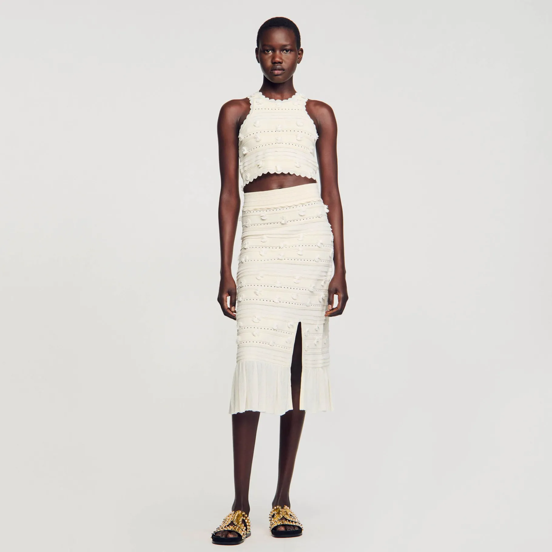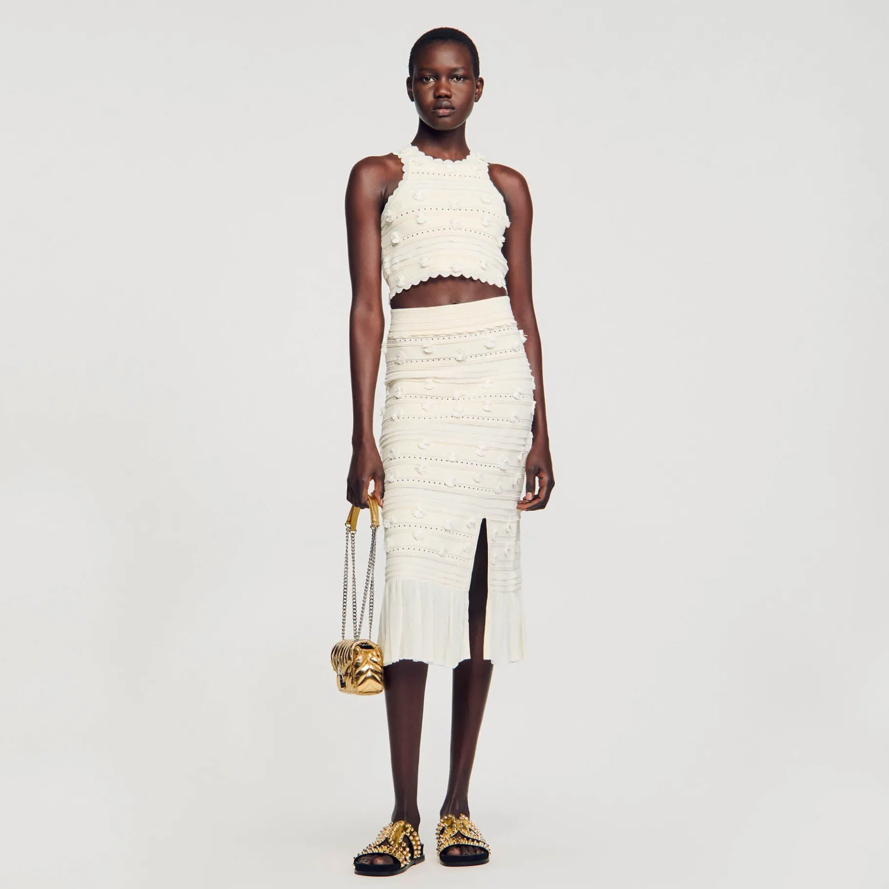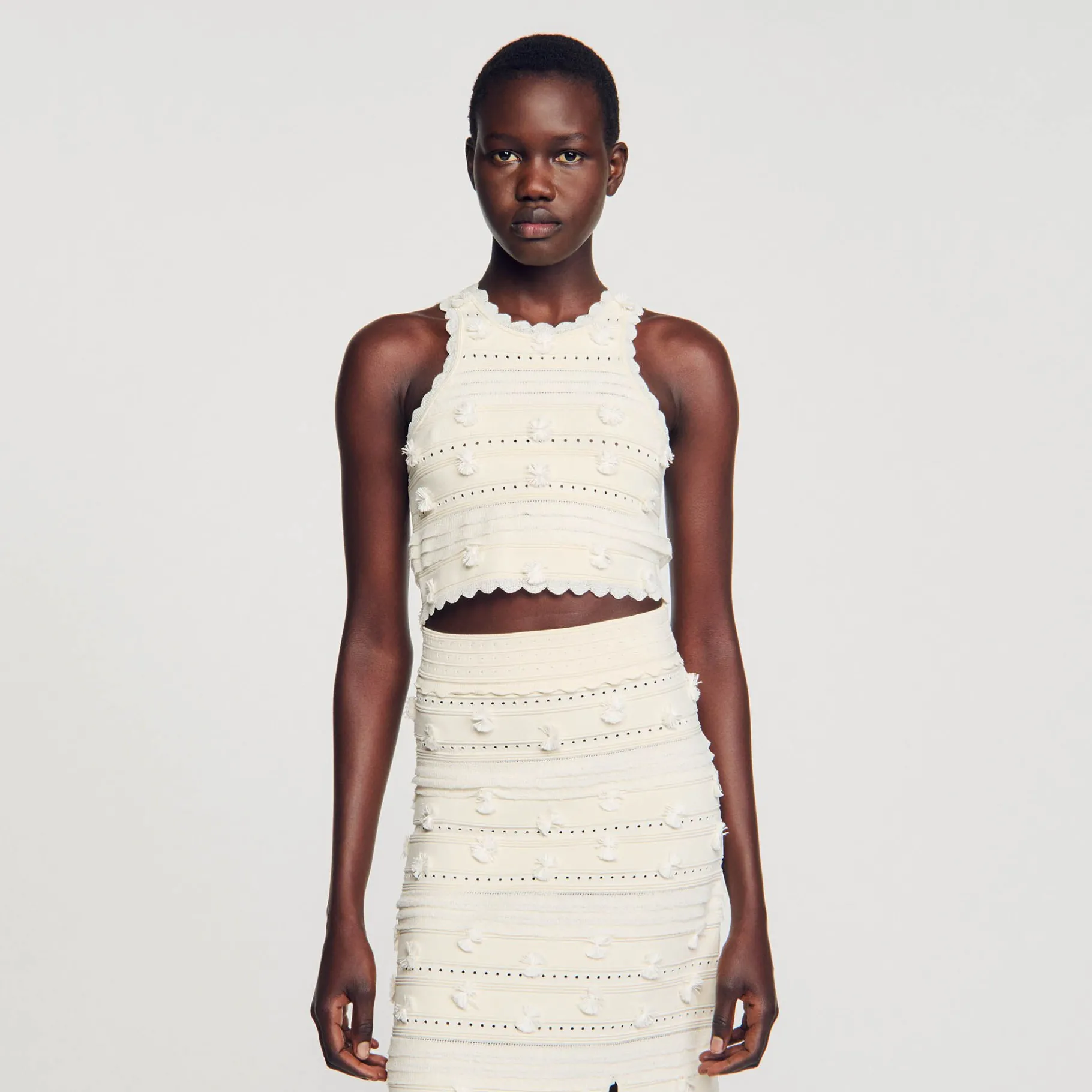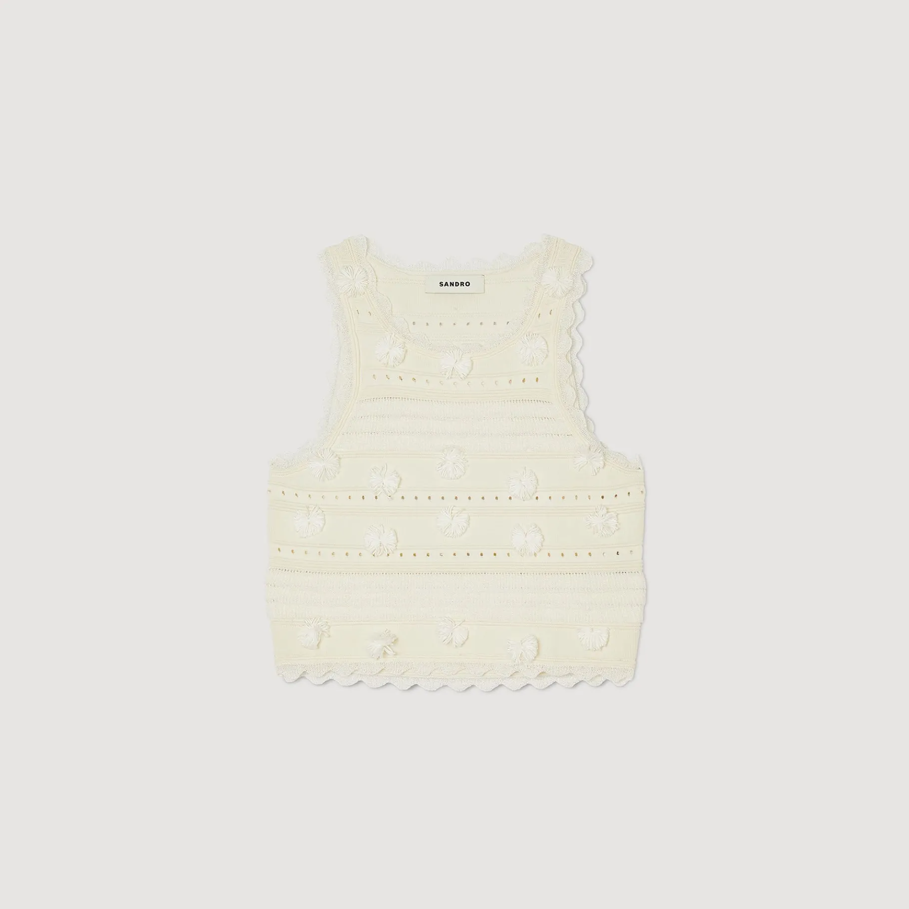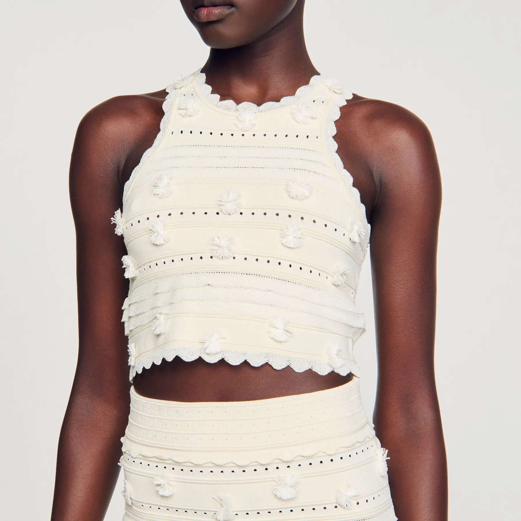 Top Corto De Punto Calado Decorado Con Pequeños Volantes Y Pompones, Con Sisas Americanas Y Acabados De Punto «Cocotte».