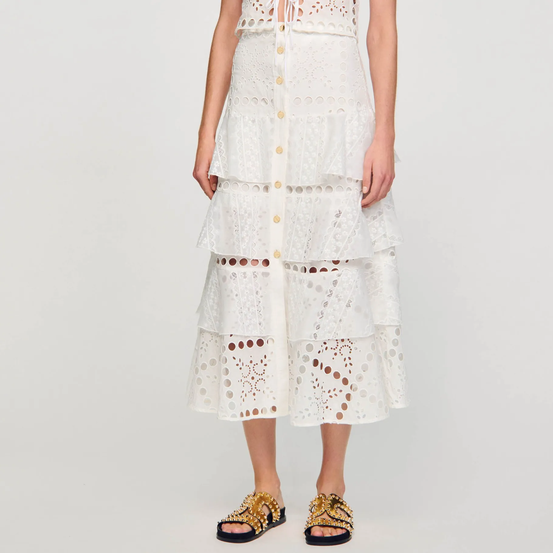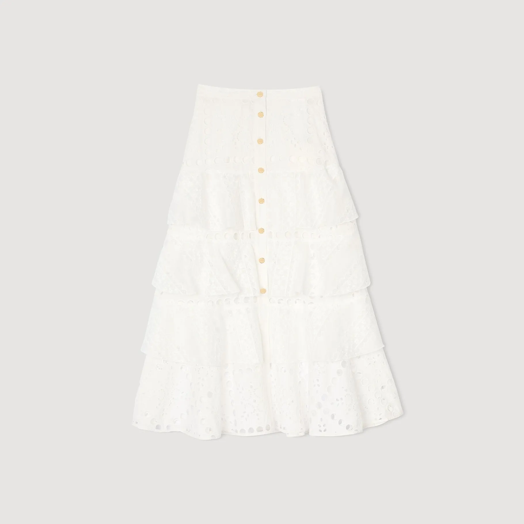 Falda Larga Con Volante, Bordado Inglés Calado, Ribetes De Encaje, Cierre De Botones Y Abertura Delantera.