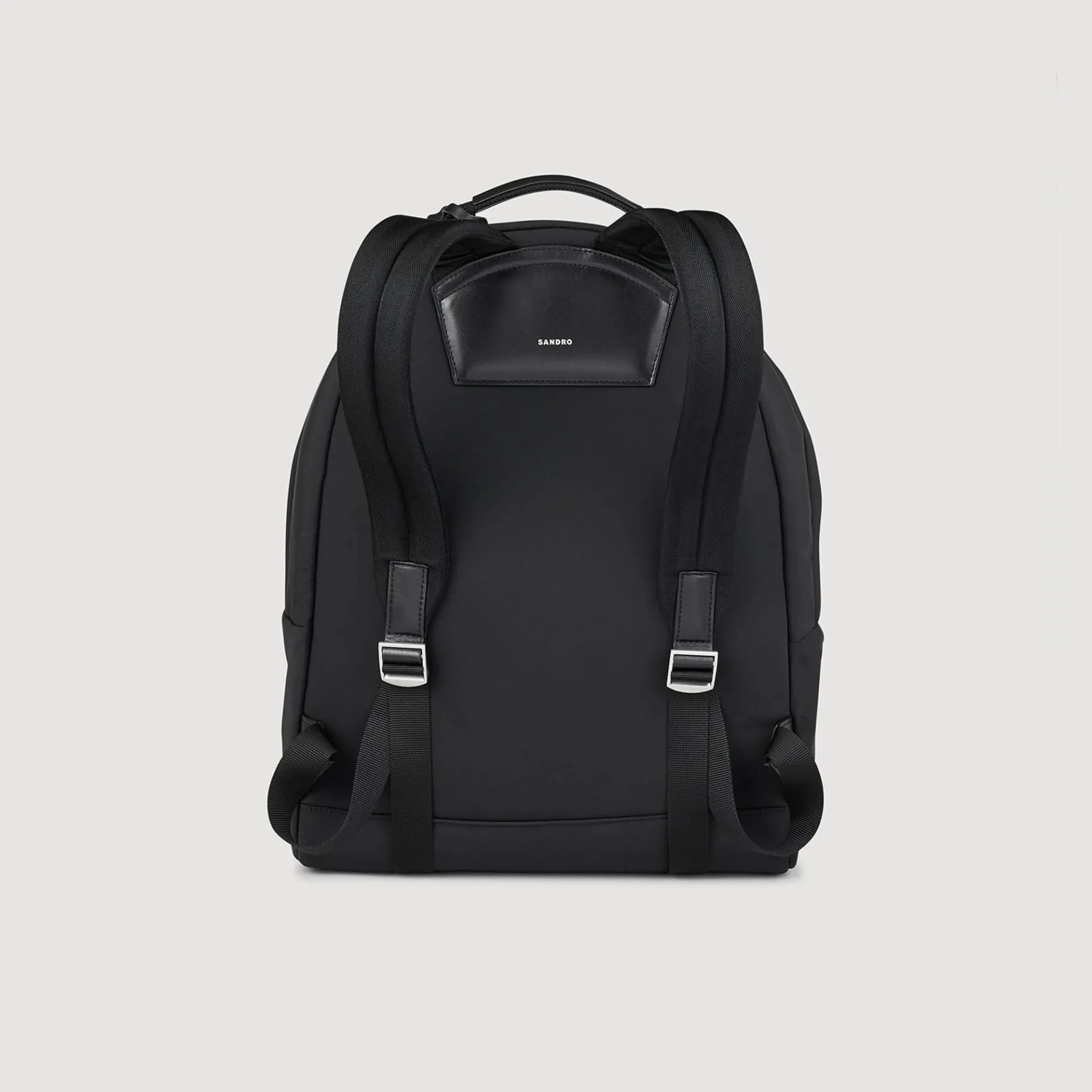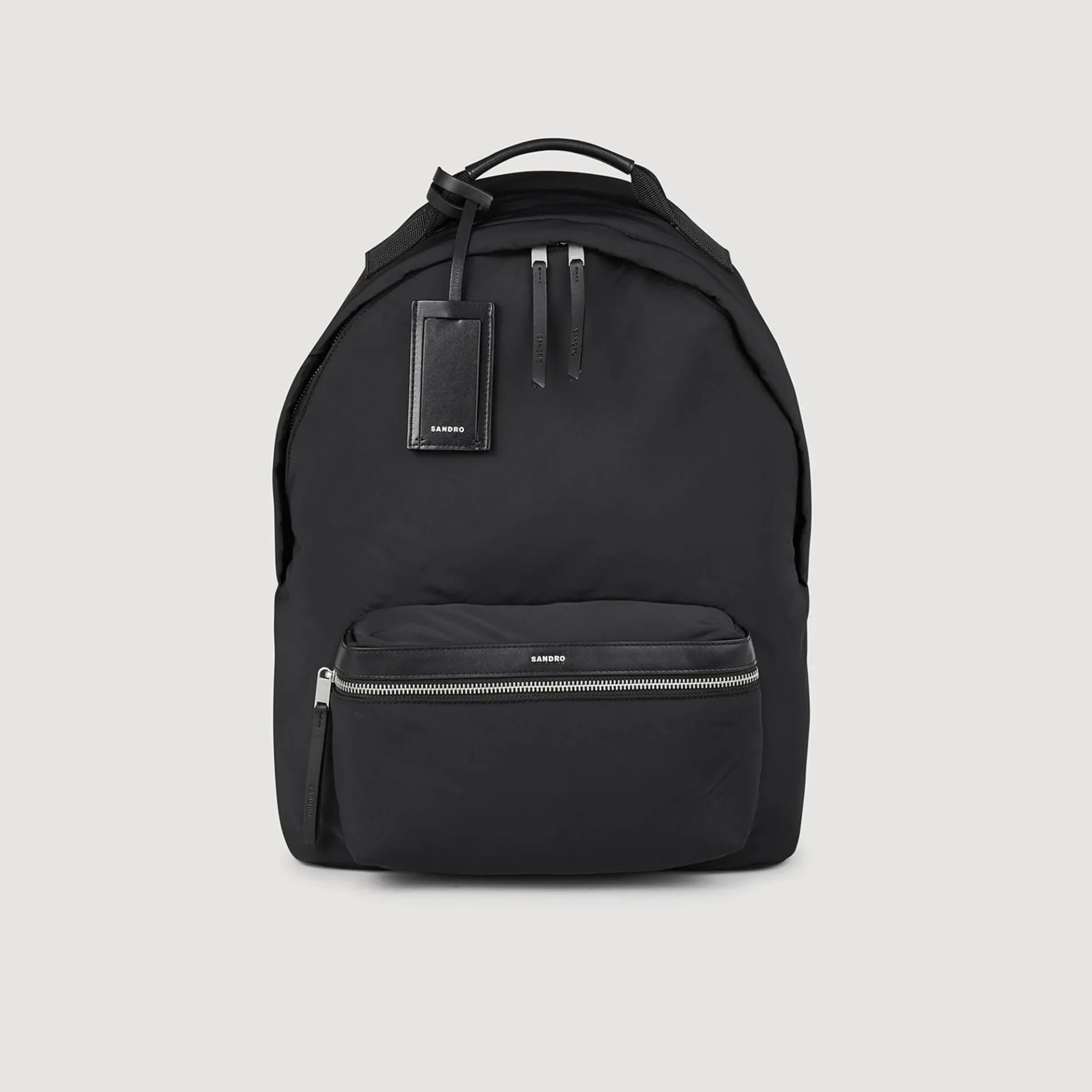 Mochila De Tela Con Detalles De Cuero, Cierre De Cremallera Con Tirador Con Relieve Sandro, Bolsillo Delantero Con Cremallera, Portaetiquetas, Bolsillo Organizador Interior Y Asas Largas Acolchadas Y Ajustables.