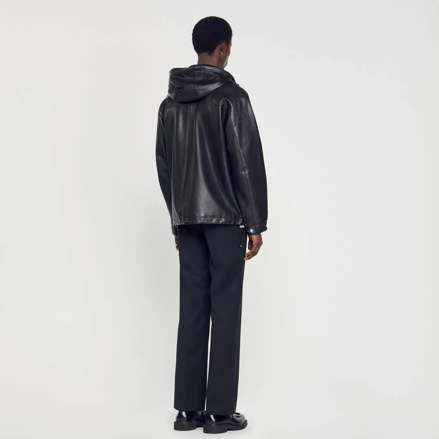 Cazadora De Cuero De Cordero Flexible, Con Una Capucha, Un Cierre De Cremallera, Manga Larga Y Cordones De Cierre.