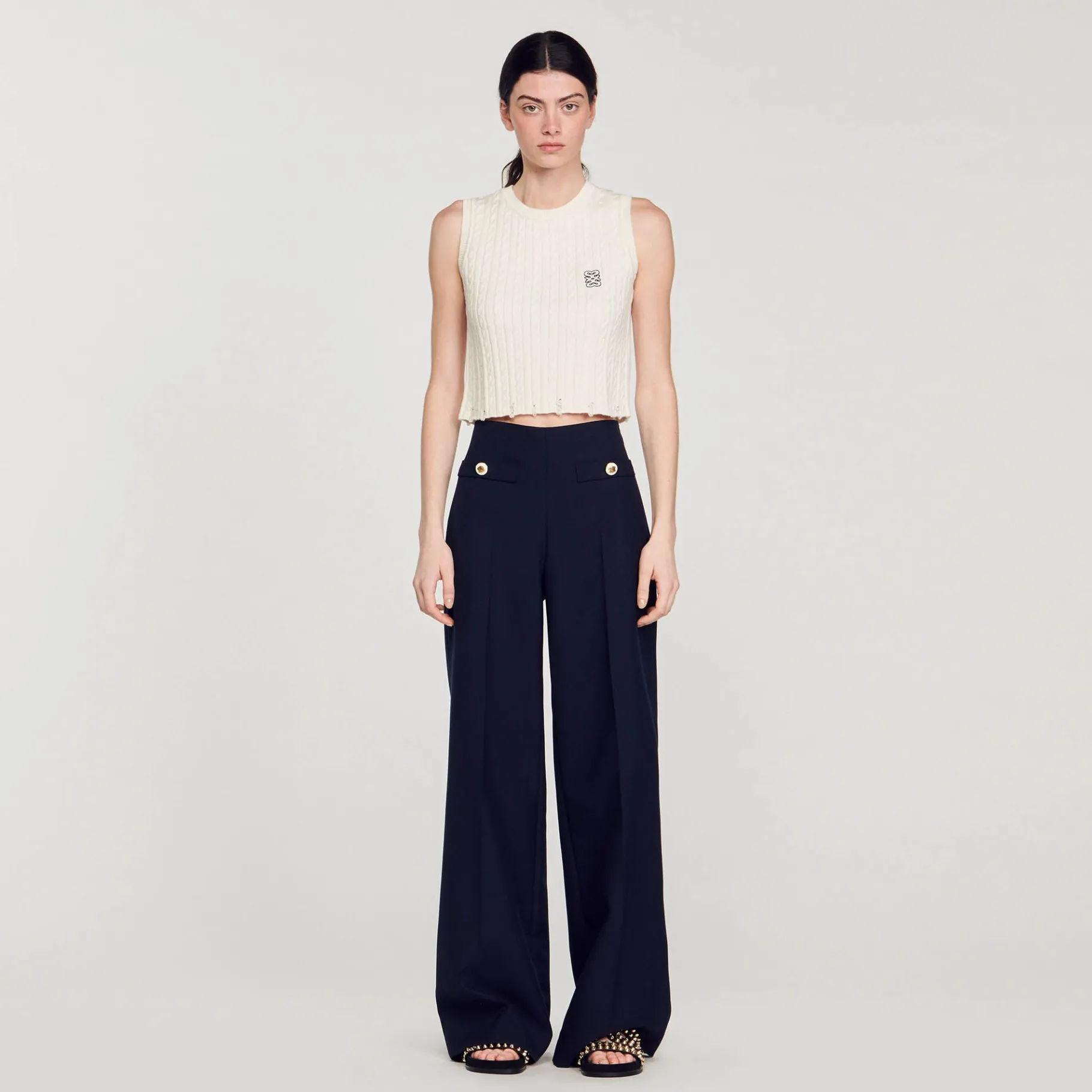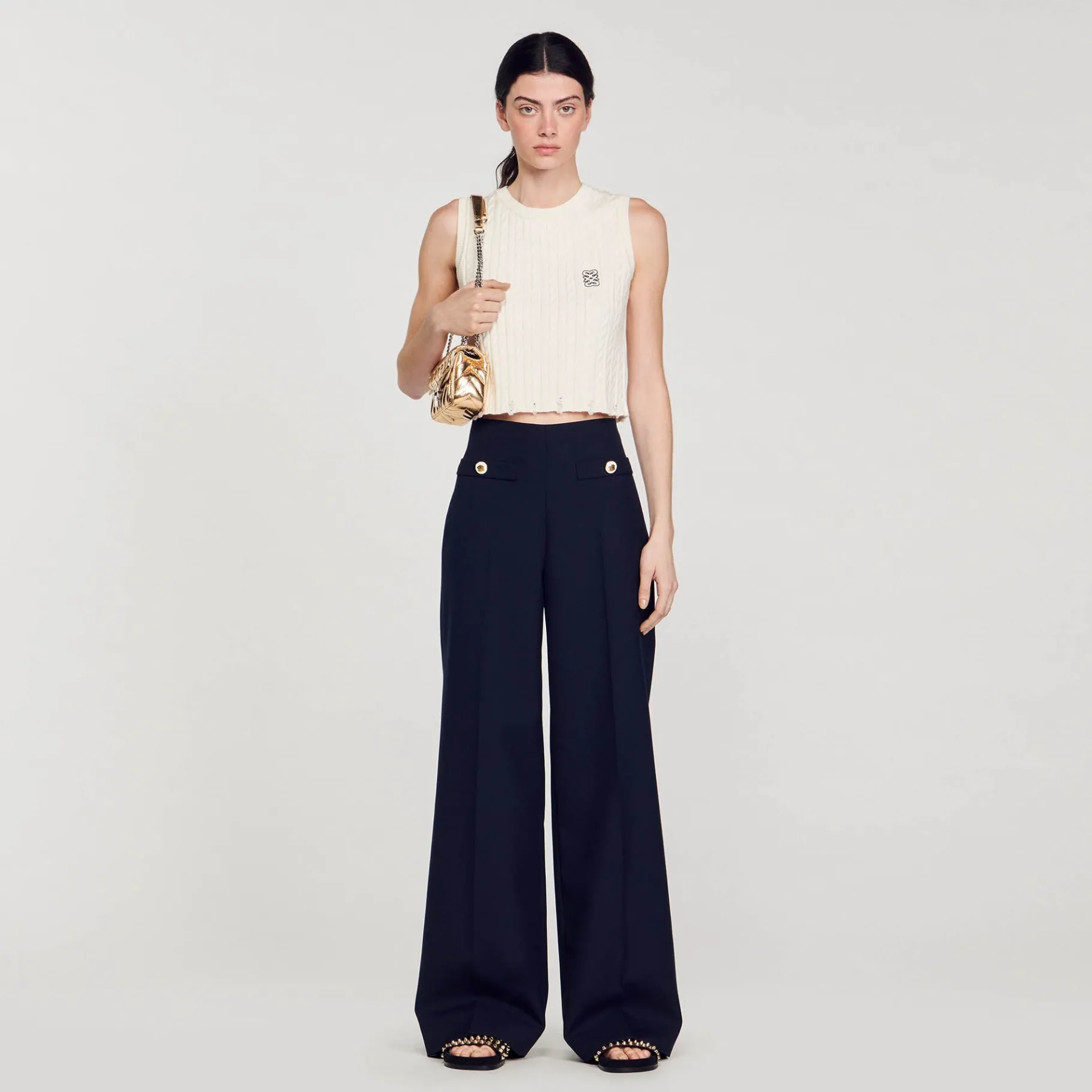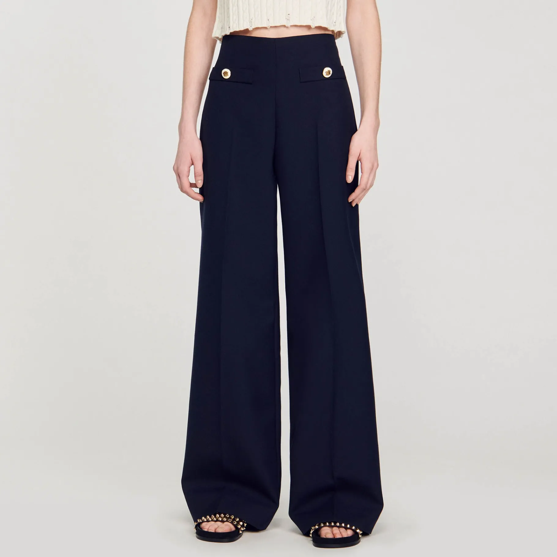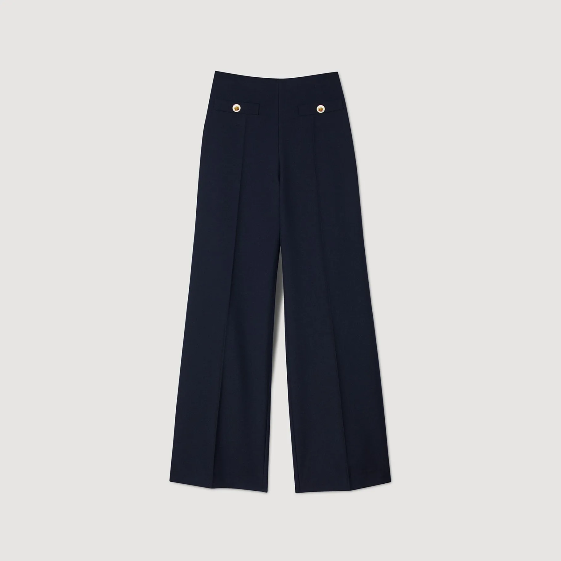 Pantalón De Sarga De Mezcla De Lana, Con Talle Alto, Bajo De La Pierna Acampanado, Bolsillos Anchos Ribeteados Con Botones De Fantasía En La Cintura Y Pinzas Marcadas En Las Piernas.