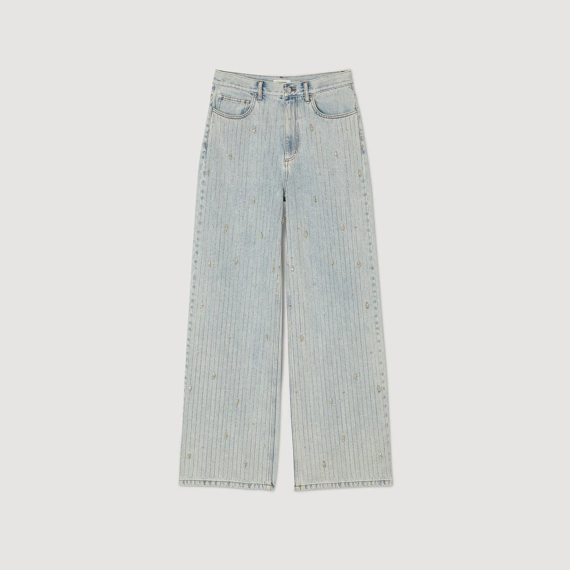 Vaquero Ancho De Tejido Vaquero Desteñido Con Bolsillos Y Trabillas En La Cintura, Decorado Con Rayas De Brillantes.
