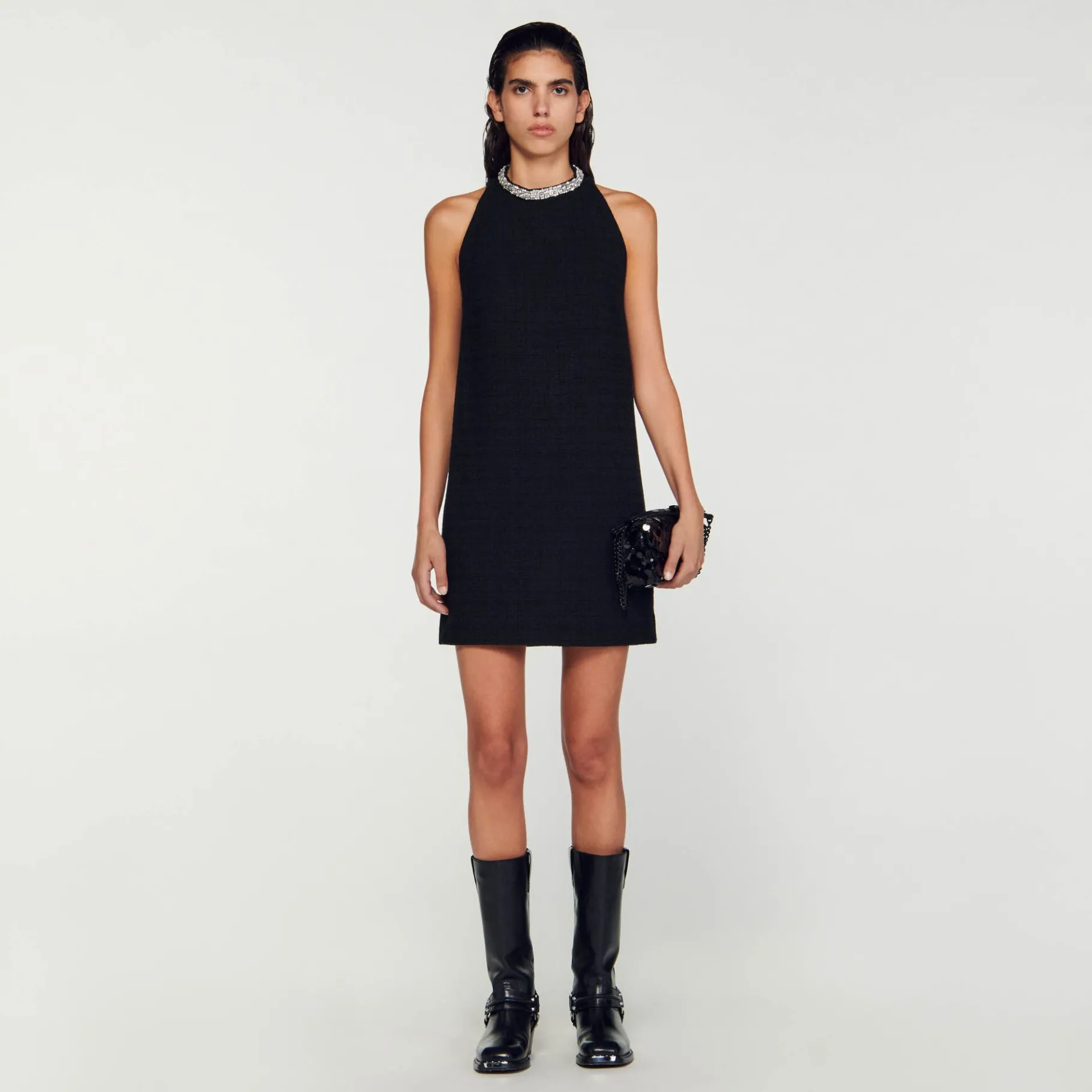 Vestido Corto De Tweed Con Sisas Americanas, Con Cuello Redondo Decorado Con Pedrería.