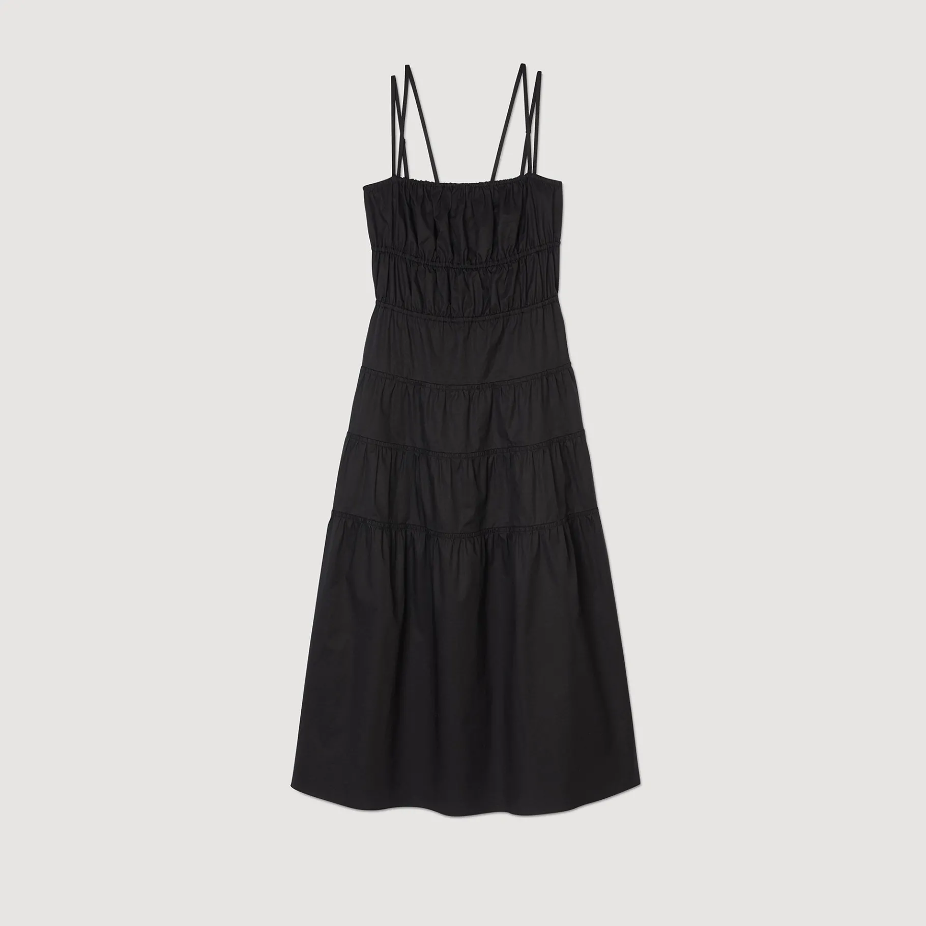 Vestido Midi De Algodón Con Bandas Fruncidas Elásticas, Tirantes Dobles, Escote Recto Y Una Falda Acampanada.