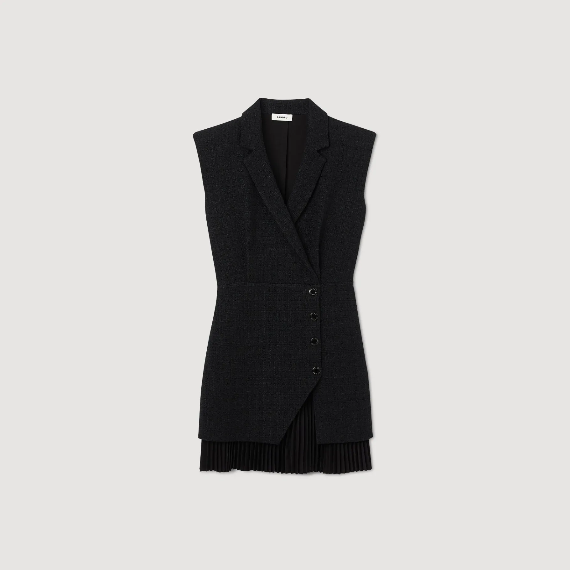 Vestido Cruzado Recto Sin Mangas Y Escote Estilo Chaqueta De Tweed, Con Falda Plisada Superpuesta Y Sublimado Con Botones Automáticos.